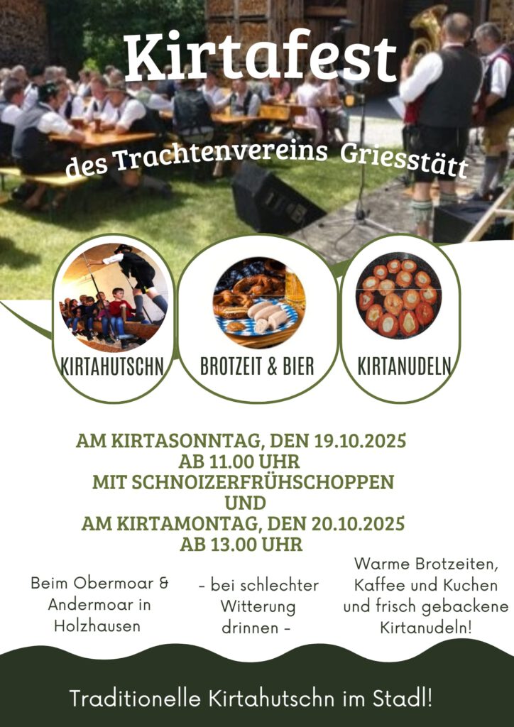 Wenn das Jahr langsam zur Neige geht, die Ernte eingefahren ist, dann ist es wieder mal Zeit zum gmiatlichen Zsamma kemma von Alt und Jung, und wo geht dies besser als bei einem zünftigen Kirtafest. Das alljährliche traditionelle Kirtafest des Trachtenvereins Griesstätt am Kirchweihsonntag und –Montag beim Obermoar und Andermoar in Holzhausen hat schon eine lange Tradition und ist vom Griesstätter Dorfleben nicht mehr wegzudenken. Das Fest beginnt am Sonntag um 11 Uhr mit einem Schnoizerfrühschoppen der Griesstätter Goaßlschnoizer. Passend dazu gibt’s frische Weißwürste. Natürlich freut man sich an beiden Tagen wieder ganz besonders auf die frisch gebackenen Kirtanudln, zudem auf Brotzeiten, Kaffee und auf die vielen selbstgebackenen Kuchen. Auch das süffige Bier zu Kirta gehört dazu.
