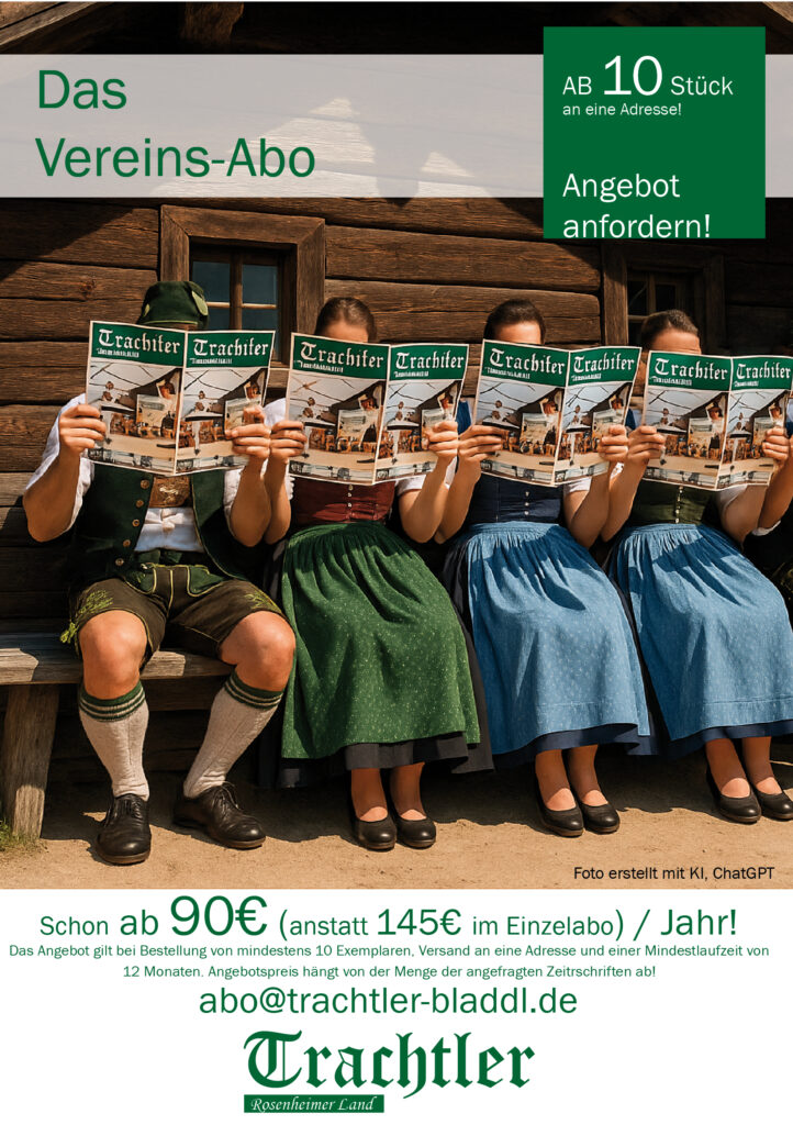 Es gibt Neuigkeiten beim TRACHTLER: Wir bieten Euch und Euren Vereinen nun die Möglichkeit eines „Vereins-Abos“. Das heißt: Ihr startet in Euren Vereinen eine Abfrage und bestellt dann die entsprechende Stückzahl als Vereins-Abo. Vorteil: die Ausgabe liegt dann bei ab 1,50€ anstatt 2,40€.